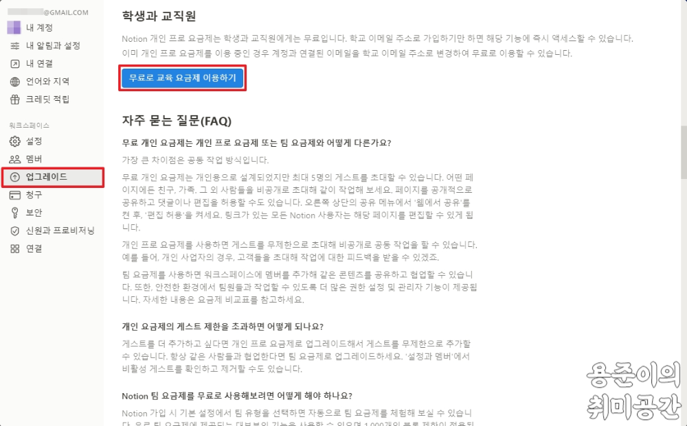 그리고 여러가지 설정 중 '업그레이드'를 클릭하면 여러 요금제를 확인할 수 있는데 개인 프로 요금제는 월 4~5달러인데 무료로 사용하기 위해 스크롤을 아래로 내려 '파란색의 무료로 교육 요금제 이용하기'를 클릭합니다.