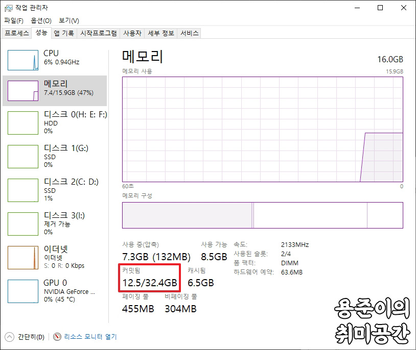 필자도 같은 방법으로 가상메모리를 설정한 이후 작업관리자의 성능 탭을 확인해 보았습니다. 커밋됨의 숫자 차이가 확실하게 늘어나고 이전에 RAM 부족으로 발생했던 모든 문제가 사라져 편안하게 사용하고 있습니다.