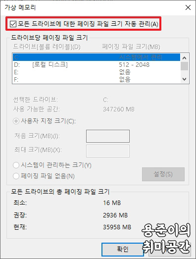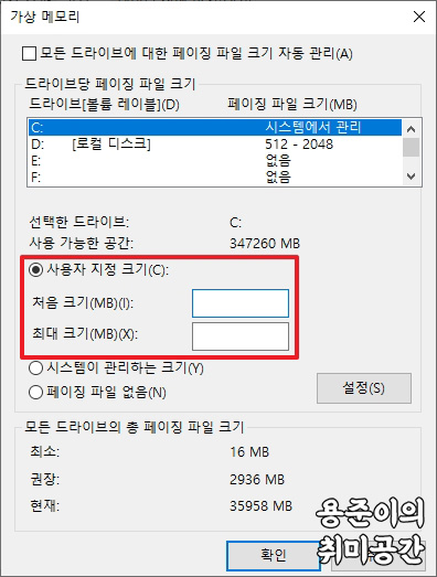 - 처음 크기 : 컴퓨터에 설치되어 있는 물리 RAM X 1024MB (예시 : 16X1024=16384)