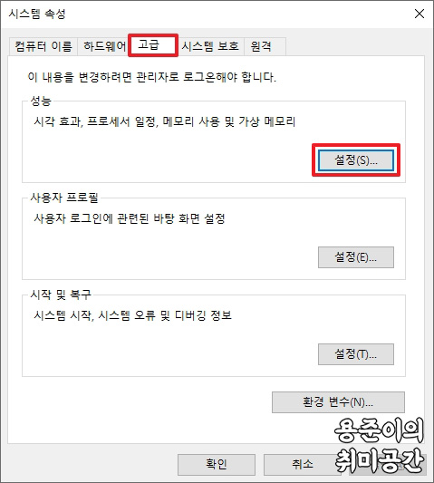 시스템 속성에서 고급 탭을 클릭하고 설정을 클릭합니다. 성능 옵션에서 고급 탭을 클릭하면 아래에 가상메모리에 대한 설정을 할 수 있는 곳이 있는데 '변경'을 클릭하여 가상메모리를 설정하는 탭을 열어줍니다.