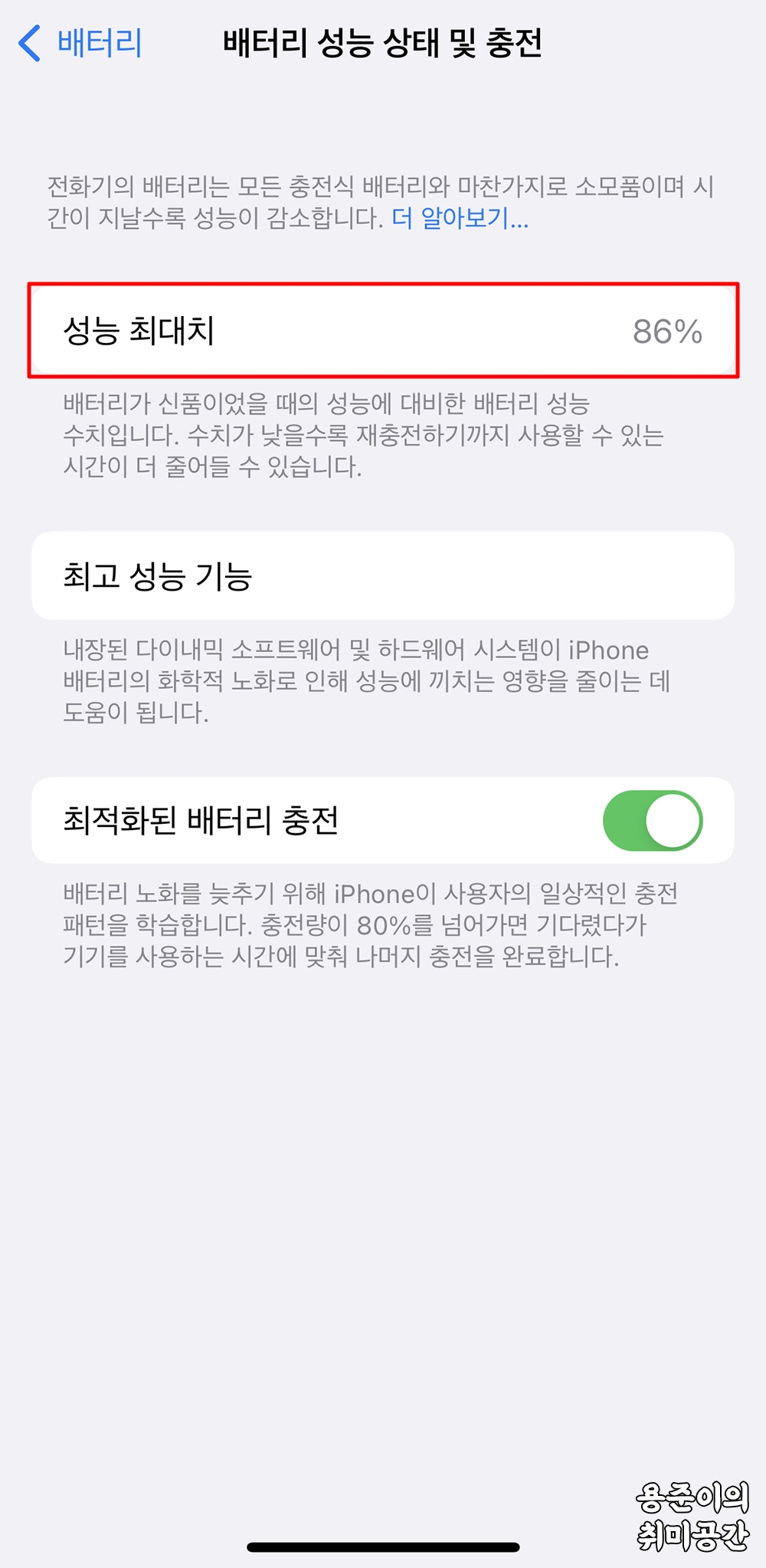 필자의 경우 배터리 교체 전 86%이던 성능이 교체 이후 100%로 정상작으로 교체된 것을 확인할 수 있다.