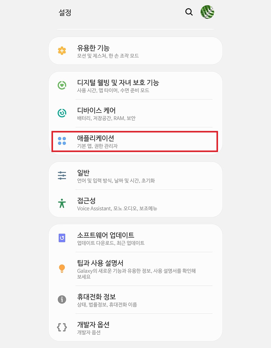 먼저 애플리케이션을 강제 중지하기 위해 설정 > 애플리케이션에서 앱 충돌이 일어난 애플리케이션 정보를 확인합니다.