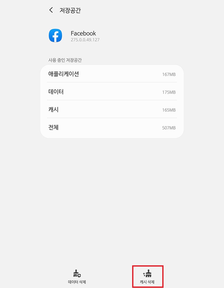 그리고 하단에 캐시 삭제를 클릭해서 캐시를 삭제 후 다시 애플리케이션을 실행하여 동일한 증상이 일어나는지 확인합니다.