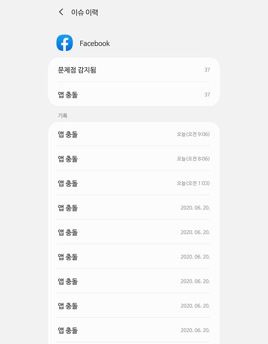 그러면 애플리케이션 별로 항목을 볼 수 있고 필자의 경우 페이스북 앱이 충돌을 일으켰는데 기록에 앱 충돌이라고 기록이 되어 있는 것을 볼 수 있습니다.