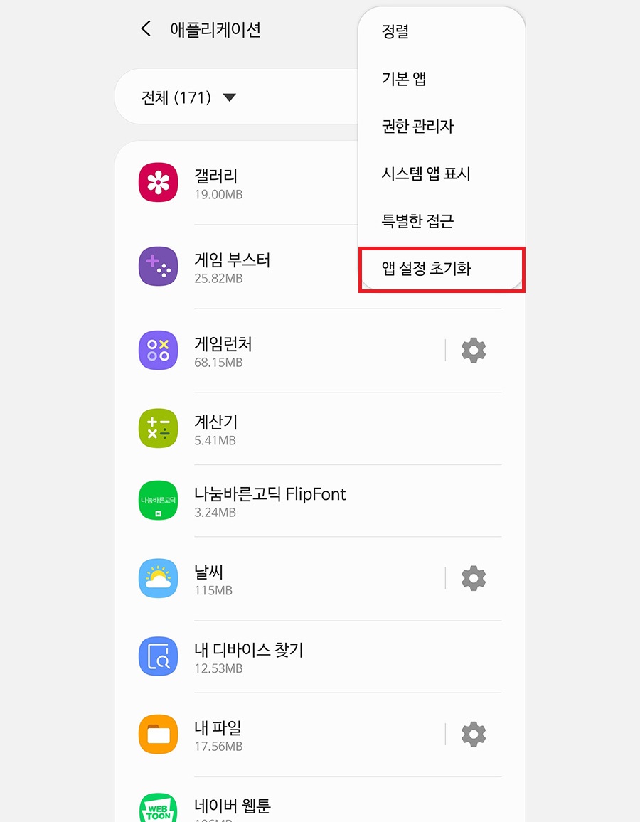2번째까지 실행을 해보았지만 앱 충돌이 계속 일어날 경우 애플리케이션에서 우측 상단에 메뉴를 클릭 후 앱 설정 초기화를 클릭하여 초기화를 클릭합니다.