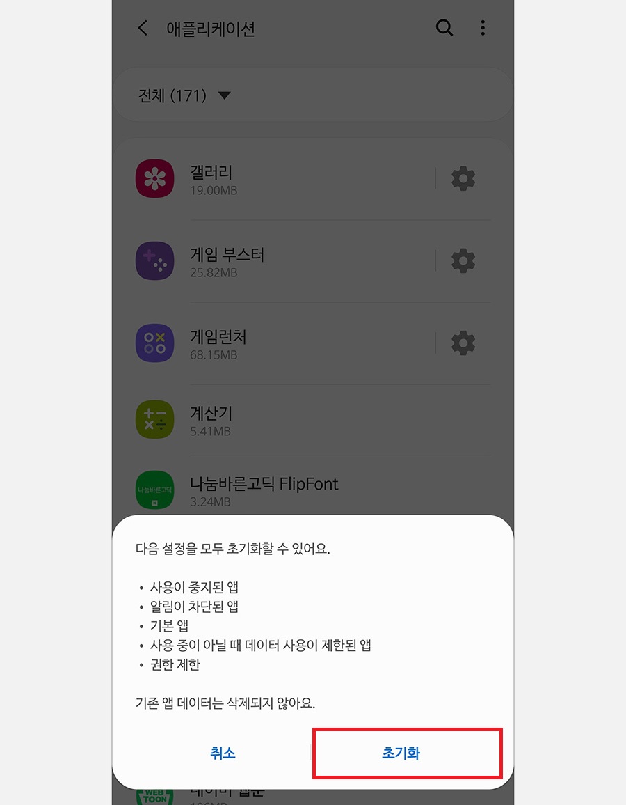 앱 설정 초기화 기능은 가장 많이 사용하는 기능으로 앱의 설정만 초기화를 하는 것이며 애플리케이션의 데이터나 정보는 초기화하지 않습니다.