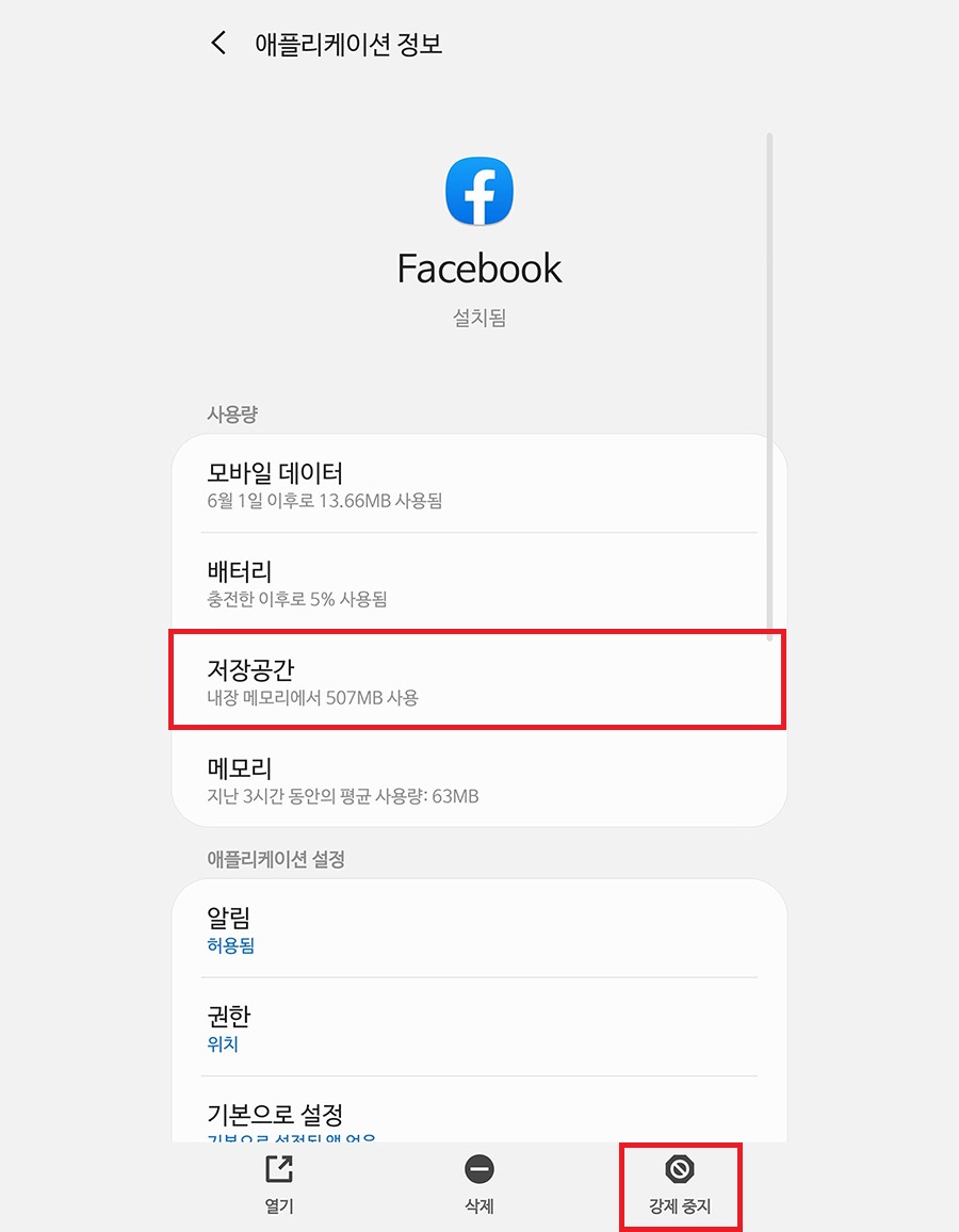 여기에서 하단에 강제 중지를 첫 번째로 클릭하여 앱을 강제로 중지하고 같은 현상이 일어나는지 확인합니다.