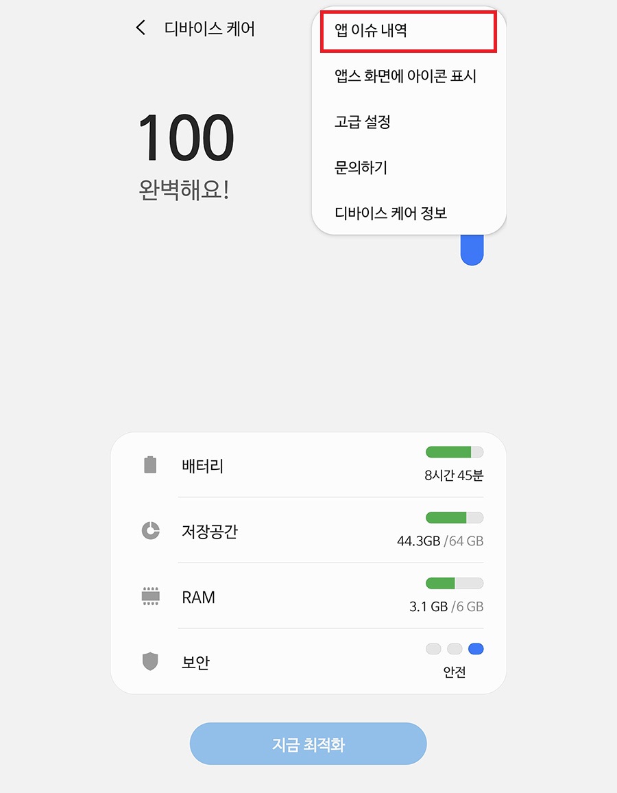 디바이스 케어에 접속하여 우측 상단에 메뉴를 클릭해서 '앱 이슈내역'을 클릭합니다.
