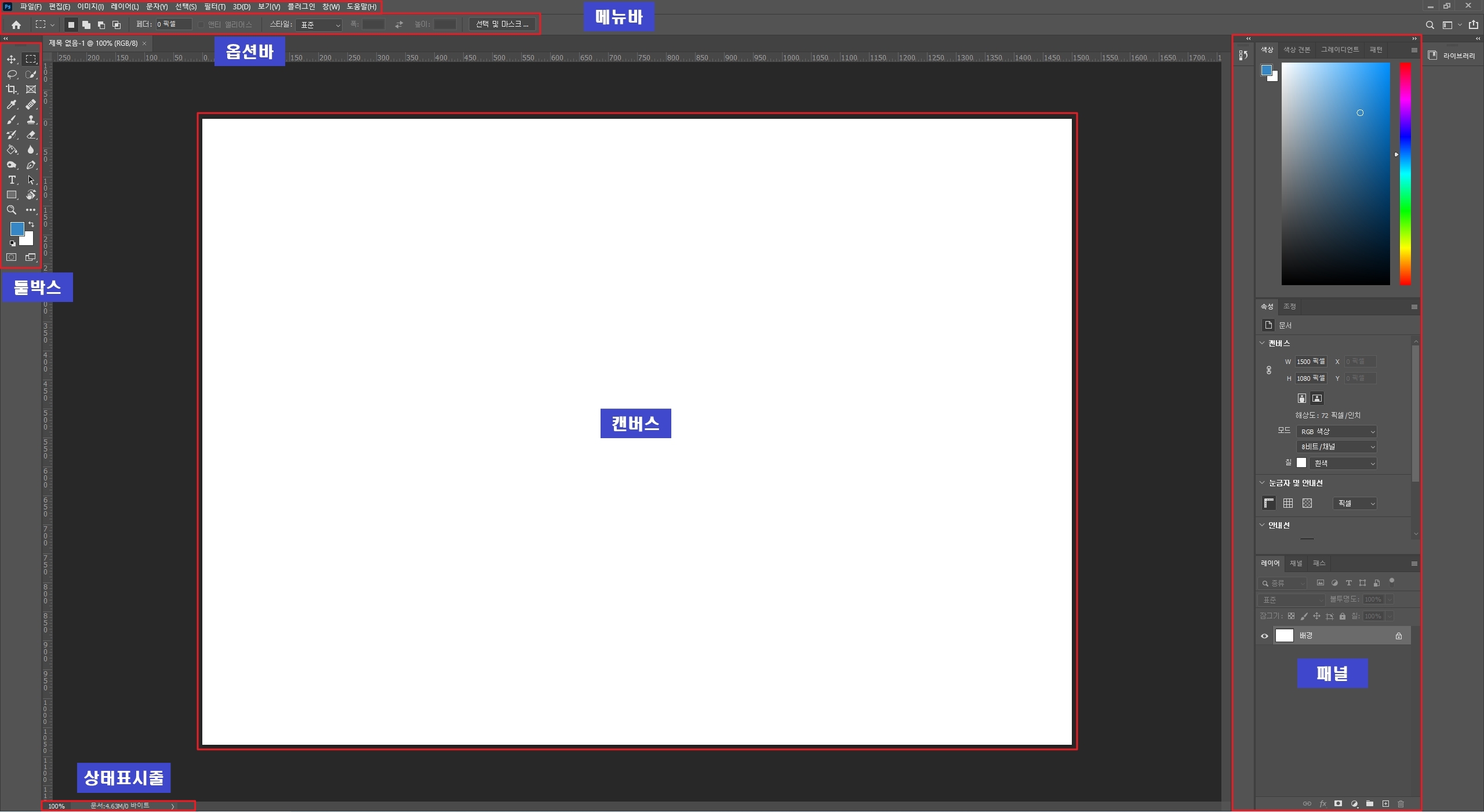 포토샵은 크게 6가지로 나뉘어 지는데 메뉴바, 옵션 바, 툴박스, 캔버스, 패널, 상태 표시줄로 되어 있습니다.