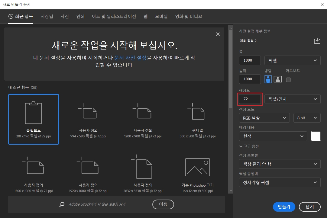 포토샵을 사용하면서 새로운 캔버스를 만들 때 해상도를 입력하여 용도에 따른 해상도를 정할 수 있습니다.