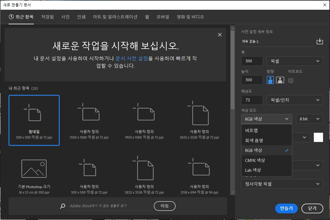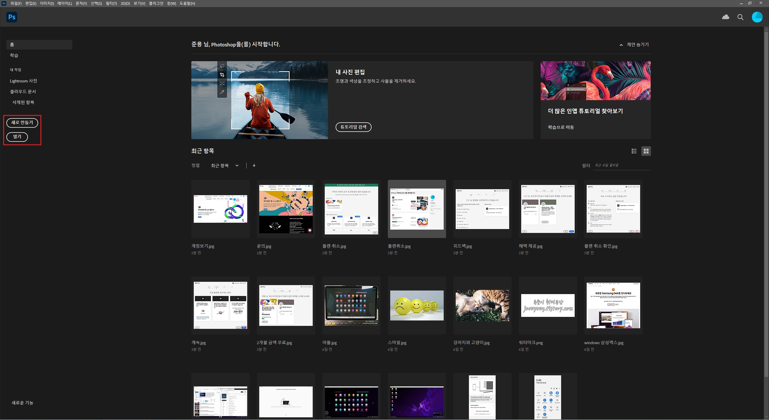 포토샵을 실행하면 중앙에 최근에 열었던 이미지 파일을 확인할 수 있고 좌측에 새로 만들기와 열기가 있습니다.