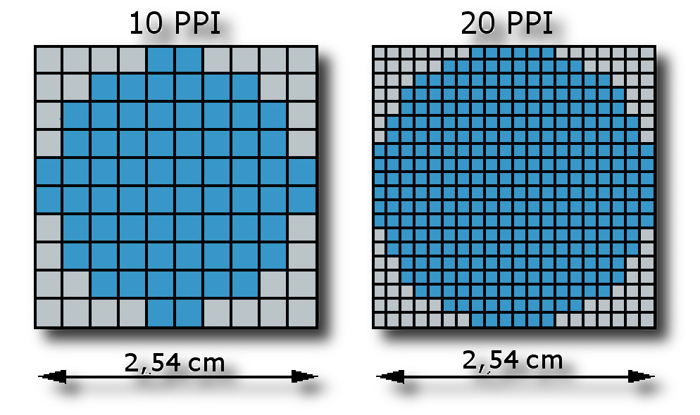 또 다른 하나는 픽셀의 집적도를 말할 수 있습니다. 픽셀의 집적도는 ppi(Pixels per Inch)로 나타내는데 1인치당 몇 개의 픽셀이 들어가는 지를 나타냅니다. 예를 들자면 10 ppi라면 1인치의 면적에 10x10개의 픽셀로 이루어져 있다는 뜻입니다.