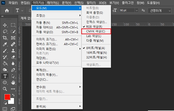 만약 모르고 작업을 시작한 경우 상단 메뉴바에서 이미지 > 모드 > CMYK 색상으로 선택을 하면 모드가 RGB에서 CMYK모드로 변경됩니다.