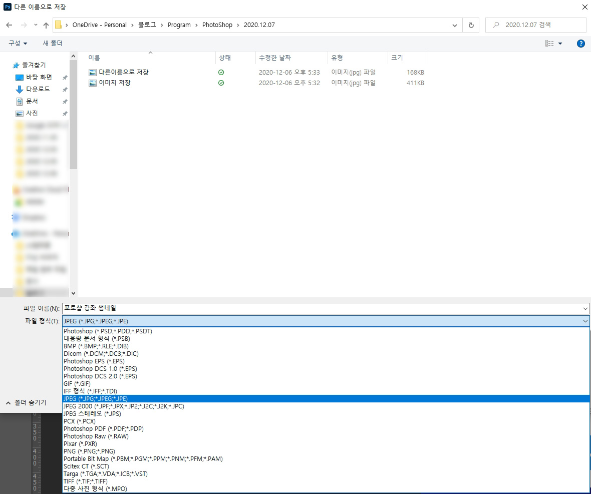 그리고 저장하고자 하는 파일 형식을 지정한 후 저장을 클릭하면 됩니다. jpg로 저장을 하고자 하는 경우 현재 필자가 선택한 JPEG로 선택을 하여 저장하면 됩니다. 이상 글을 마치겠습니다.