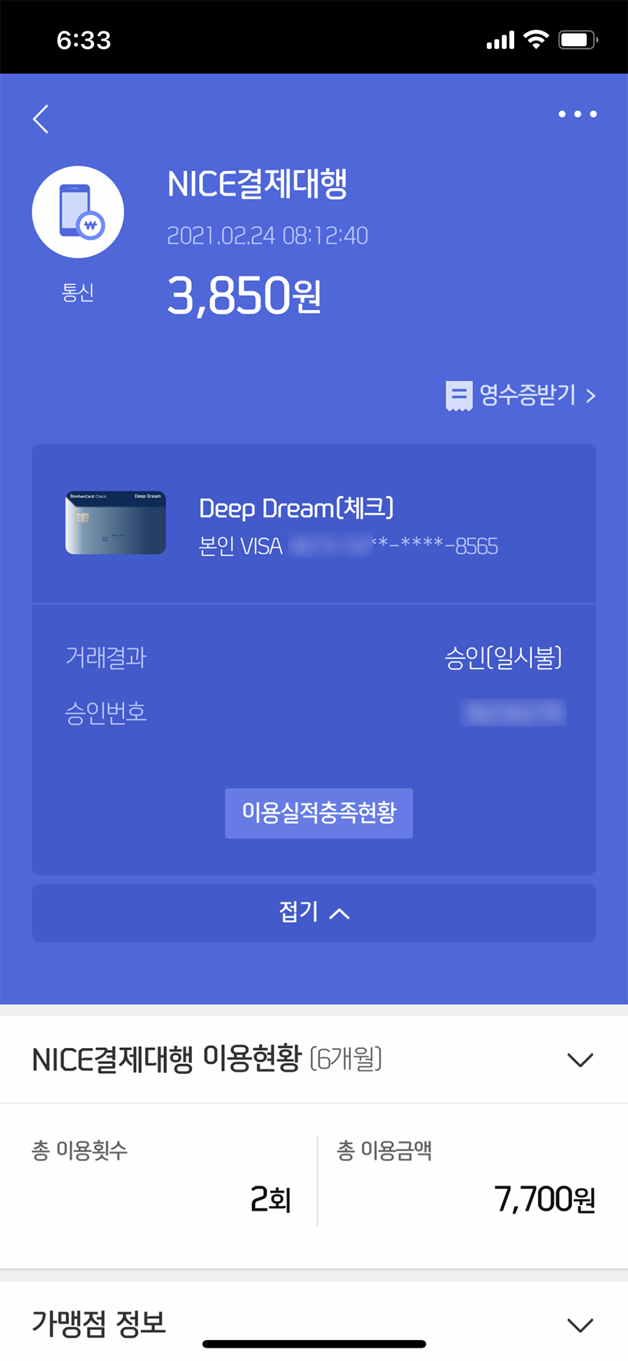 다만 결제내역을 확인하기 위해서는 카드 종류에 따라 카드사의 승인번호가 필요한데 필자의 경우 신한카드로 결제를 하여 신한 FAN페이 어플을 사용하고 있습니다. 이 앱을 통해 결제내역을 확인해보면 승인번호를 결제 내역과 영수증에서 확인할 수 있습니다.