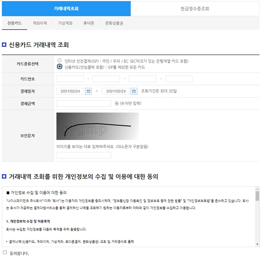 승인번호를 확인한 후 결제한 카드에 종류를 선택하고 ISP결제의 경우 카드번호나 승인번호를 입력 후 보안 문자와 개인정보 수집 동의를 합니다.
