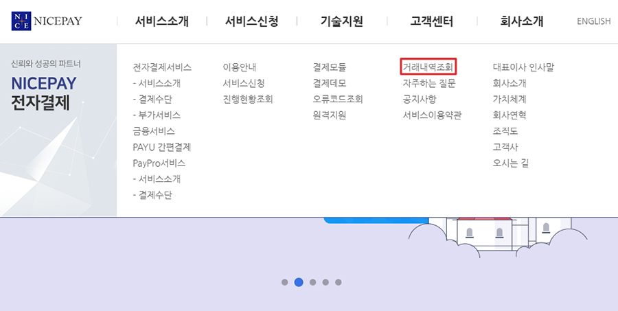 NICE결제대행에서 결제내역을 확인하기 위해 NICE PAY 홈페이지에 방문한 후 상단메뉴에 고객센터 > 거래내역조회를 클릭합니다.