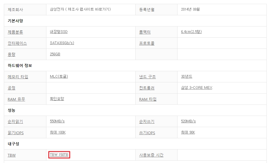 또한 제가 구매한 SSD의 상세정보를 살펴보면 내궁성이 TBW 150TB로 표시되어 있는데 총 쓰기량이 26808GB로 표시되어 있는 것을 보면 26TB를 사용한 것을 확인할 수 있습니다. 이렇게 보면 전체 내구성의 약 17% 정도를 사용했다는 것을 확인할 수 있습니다.