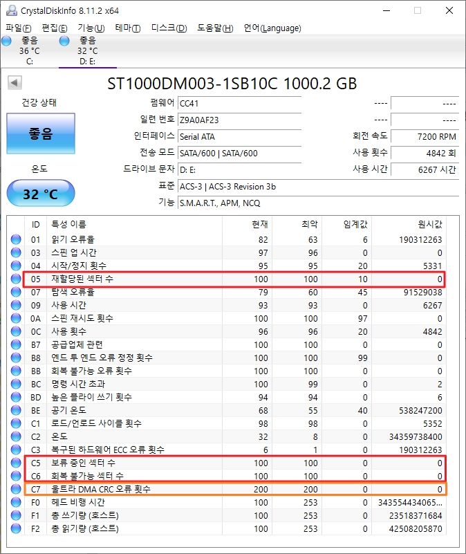 HDD 수명의 경우 기본적으로 건강상태를 보면 간단하게 확인할 수 있지만 05 재할당된 섹터 수, C5 보류 중인 섹터 수, C6 회복 불가능 섹터 수가 베드 섹터와 관련된 항목인데 원시 값이 0이 아닌 점점 숫자가 올라간다면 HDD를 교체할 준비를 해야 합니다.