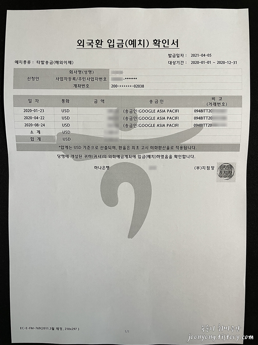 세무서에 맡기면 쉽게 할 수 있지만 개인이 신고하는 경우 이와 같은 서류가 필요하기 때문에 애드센스 세금신고 시 필요한 외화 입금확인서를 은행별로 알아보돍 하겠습니다.