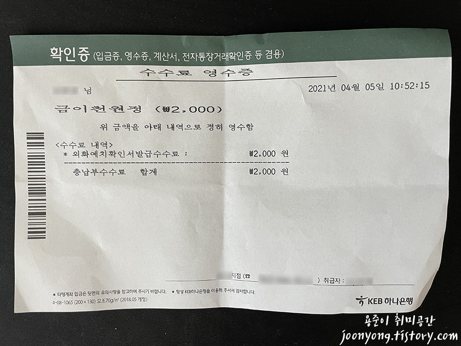 다만 외화 입금확인서를 발급받으면 수수료가 2,000원이 부과되어 다른 증명서에 비해 상당히 수수료가 부과되는 것을 볼 수 있습니다.