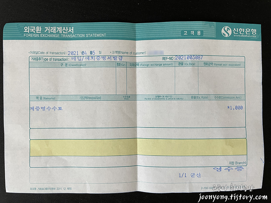 신한은행에서는 하나은행보다 1,000원 적은 1,000원의 수수료가 발생하였습니다. 하나은행보다 수수료가 적지만 양식이 조금 부족하다는 느낌이 들었습니다.
